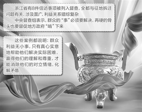 浙江省有8件信访事项被列入督查,全都与征地拆迁问题有关,涉及面广、利益关系错综复杂,处理不当易引发大面积上访。因此,群众合情合理合法的诉求,必须解决到位。但是,有的诉求过高,政策框架下无解,成为“死结”。中央督查组表示,群众的“事”必须要解决,再硬的骨头也要督促地方政府“啃”下来。