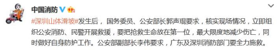 中新网12月20日电 据公安部消防局官方微博消息,深圳山体滑坡发生后, 国务委员、公安部长郭声琨要求,核实现场情况,立即组织公安消防、民警开展救援,要把抢救生命放在第一位,最大限度地减少伤亡,同时做好自身防护工作。公安部副部长李伟要求,广东及深圳消防部门要全力施救。