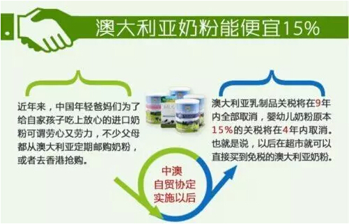 除了这些,海淘的中国父母们,可能要问,罐装婴儿奶粉要降价不?根据中国商务部的说法,中澳双方的谈判结果是,包括奶粉在内的乳制品,中国目前实施的10%-20%的关税将分9到11年逐步降为零,其中奶粉保留了特别保障机制。这些措施,目的是让国内乳业有较长时间逐步适应。