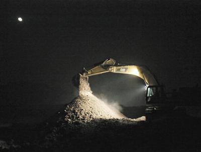 重型钩机凌晨潮河“吸砂”