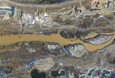 12月4日下午1时,潮河密云高岭镇下会村段遍布大坑。 因近期盗砂不断,河道变窄,河水污染。图为无人机航拍画面。 A08-A09版摄影/新京报记者 王子诚 彭子洋