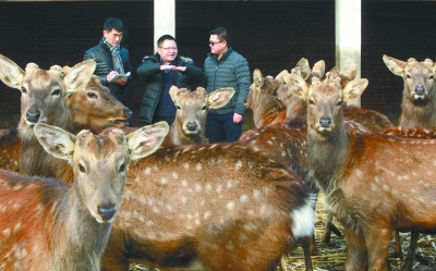 何剑斌(中)与团队成员在鹿场查看梅花鹿生长情况。