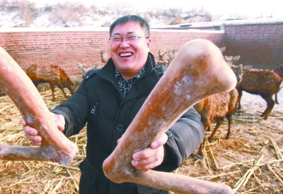 西丰县海燕鹿场场长罗剑通展示4.5公斤重的二杈鹿茸。