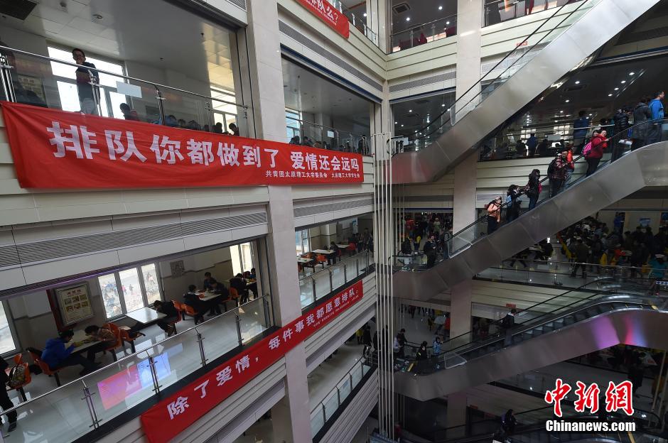 12月23日,山西太原理工大学,写有“排队你都做到了,爱情还会远吗”等3条宣传语的条幅悬挂在校园食堂内,提醒学生排队就餐遵守秩序。宣传语内容诙谐幽默,成为学生们议论的焦点。 武俊杰 摄