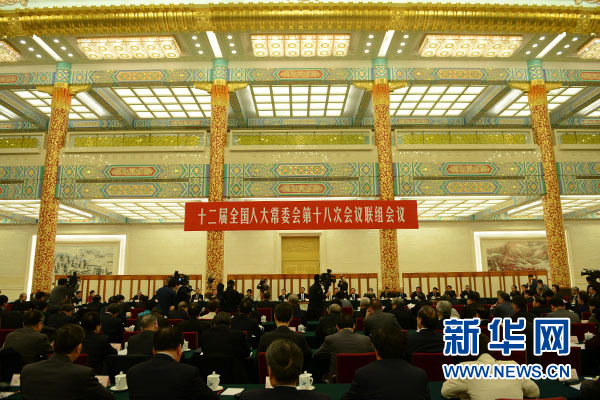 12月26日下午,十二届全国人大常委会第十八次会议举行联组会议,就国务院关于2014年度中央预算执行和其他财政收支审计查出问题整改情况的报告进行专题询问。图为会议现场。新华网 郭小天摄