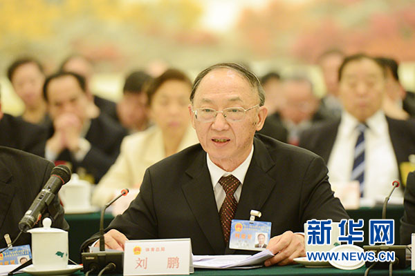 12月26日下午,十二届全国人大常委会第十八次会议举行联组会议,就国务院关于2014年度中央预算执行和其他财政收支审计查出问题整改情况的报告进行专题询问。图为体育总局局长刘鹏回答问题。新华网 郭小天 摄