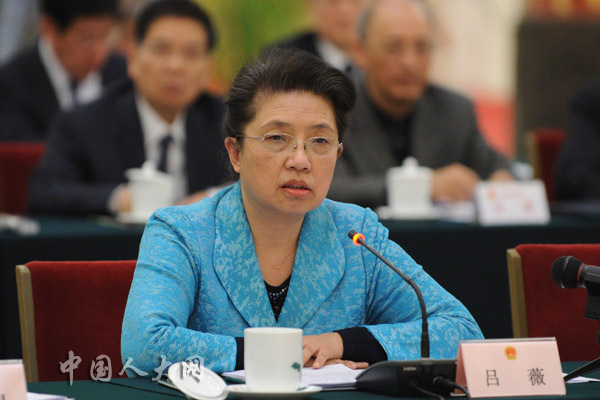 12月26日下午,十二届全国人大常委会第十八次会议举行联组会议,就国务院关于2014年度中央预算执行和其他财政收支审计查出问题整改情况的报告进行专题询问。图为全国人大常委会委员吕薇提问。中国人大网 李杰 摄