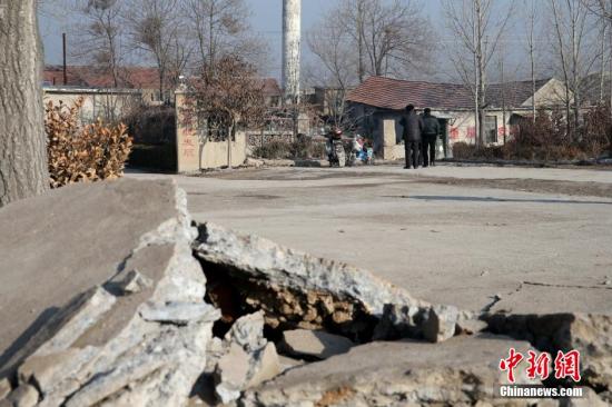 12月26日,山东平邑石膏矿塌方事故现场附近道路开裂房屋倾斜。共有来自武警、消防、医疗、救援、掘进等领域的685人参与本次救援。梁犇 摄