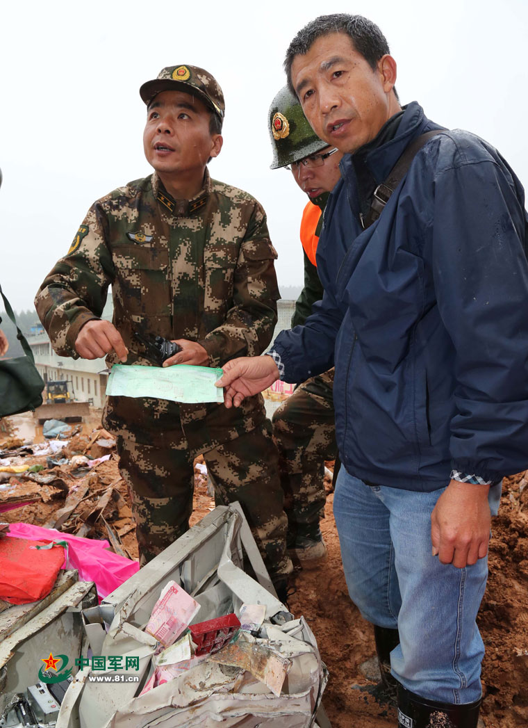 武警交通部队救援官兵正在清理查验抢救出来的群众钱物。涂敦法 摄
