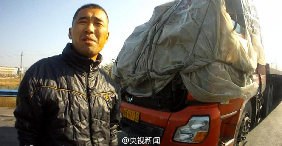 组图:大货车车头蒙塑料布上高速