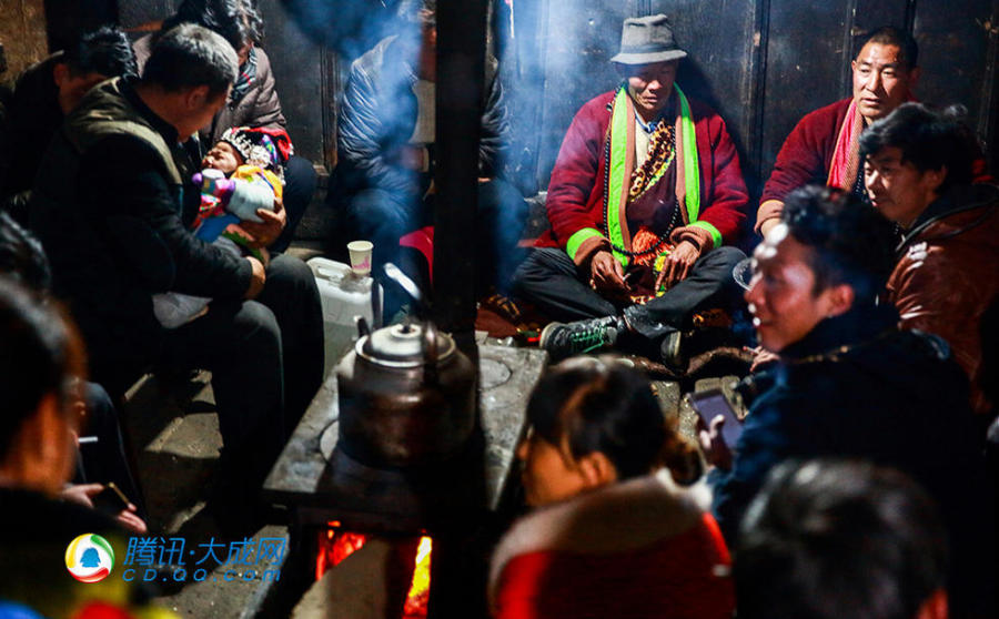 晒佛节前一晚,喇嘛来到存供唐卡的其中一户人家通宵念经,村里的男女老少都会在这之前赶回家。