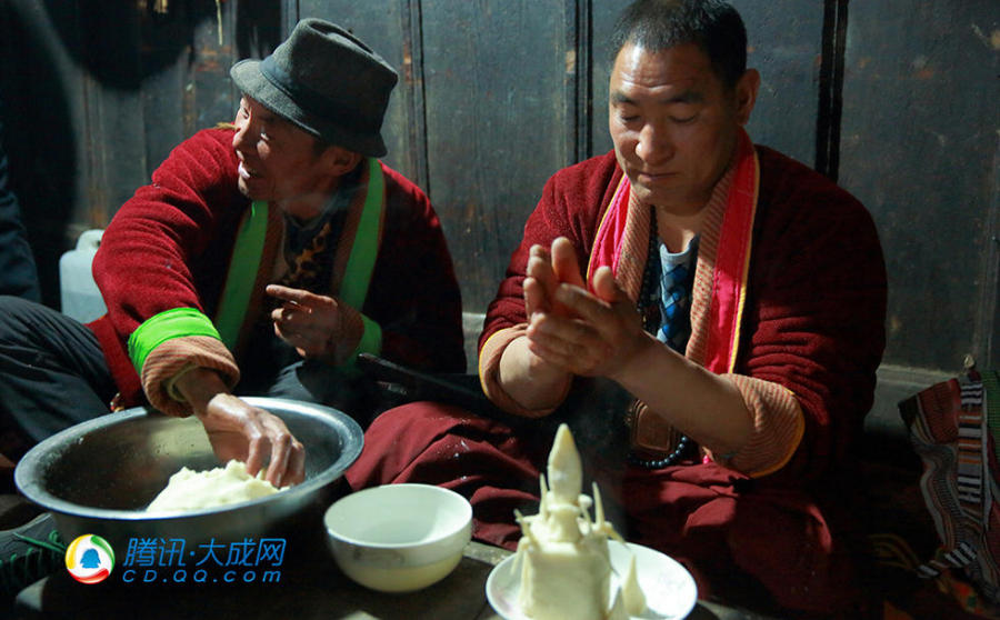 喇嘛用青稞粉制作第二天晒佛节需要的道具。