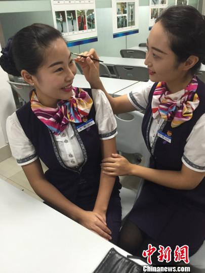 图为海南环岛高铁列车乘务员学习化妆技巧。 李兰芳 摄