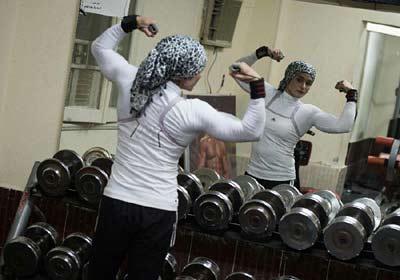 健美运动起源于古希腊,最初只有男子参加。虽然现代健美活动已经风靡全球,但在埃及,受传统观念的影响,健美活动仍很难看到女性的影子。而这并不能阻挡埃及女青年对健与美的追求,今年27岁的胡路德·埃萨姆就是其中一位,她从事健美活动两年多,自称是埃及的“钢铁女侠”,当地媒体和健美圈称她为“埃及女性健美第一人”,在脸谱社交网站上已经拥有一万多名粉丝。谈到未来,胡路德·埃萨姆的下一个目标是参加国际大力士挑战赛。图为12月29日,胡路德·埃萨姆在开罗一家健身馆内展示肌肉。