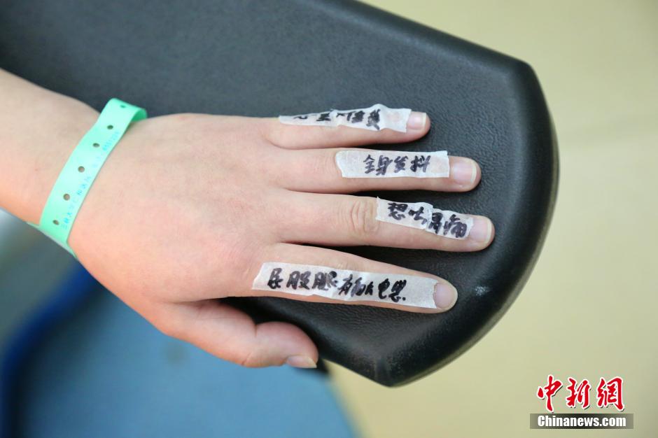 图为一声将各种不适的感觉粘贴在王荧荧的手指上。 李晓婷摄