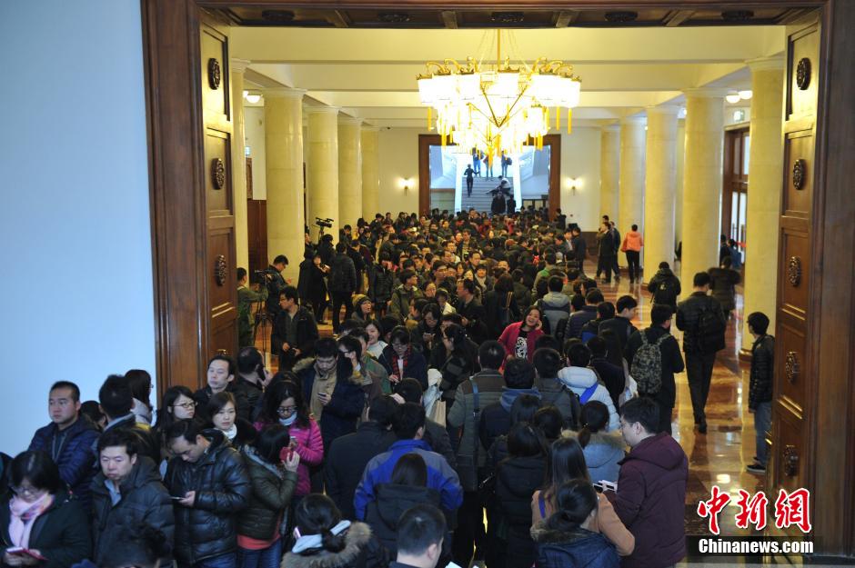 3月1日,参加全国“两会”采访的记者排队依次领取采访证件。参加2015全国“两会”的中外记者总数突破3000人。中新社发 张浪 摄