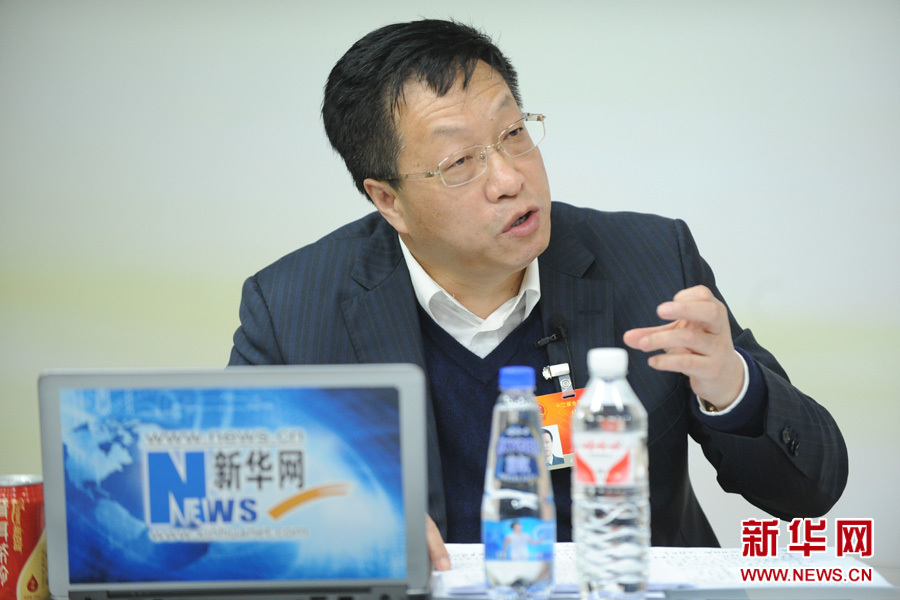 2015年3月3日,全国人大代表、东北师范大学校长刘益春做客新华会客厅。图为刘益春在访谈现场。新华网 贾振 摄