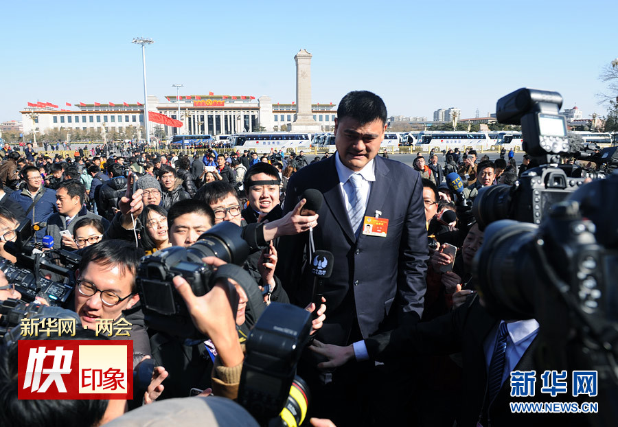 3月3日,中国人民政治协商会议第十二届全国委员会第三次会议在北京人民大会堂开幕。这是记者们在人民大会堂东门外广场拍摄全国政协委员姚明。 新华网 翟子赫 摄