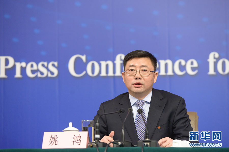 十二届全国人大三次会议新闻中心于3月6日16时在梅地亚中心多功能厅举行记者会,邀请农业部副部长余欣荣,农业部总经济师、新闻发言人毕美家就“推进改革创新,加快建设现代农业”的相关问题回答中外记者的提问。图为记者会主持人姚鸿。新华网/中国政府网 郭小天摄