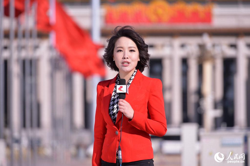 美女记者在人民大会堂前采访。ChinaFotoPress/CFP