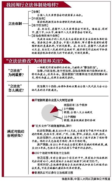 已经实施14年的立法法,去年进入修订程序。2014年8月和12月,全国人大常委会两次审议立法法修正案草案,本次大会将是草案的三审。