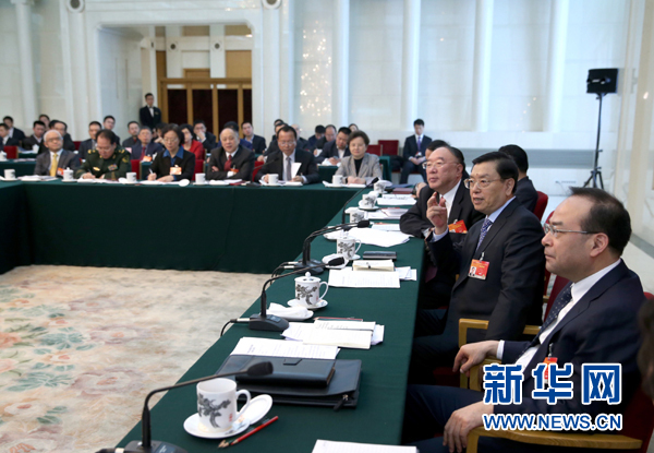 3月9日,中共中央政治局常委、全国人大常委会委员长张德江参加十二届全国人大三次会议重庆代表团的审议。 新华社记者马占成摄