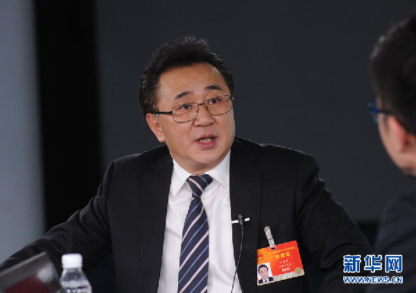2015年3月10日,全国人大代表、安徽省蚌埠市委副书记、市长白金明做客新华访谈,与网友分享他对依法治国、依法行政的体会和期待,以及介绍建设法治蚌埠的规划部署。图为白金明与主持人交谈。 新华网 陈竞超 摄