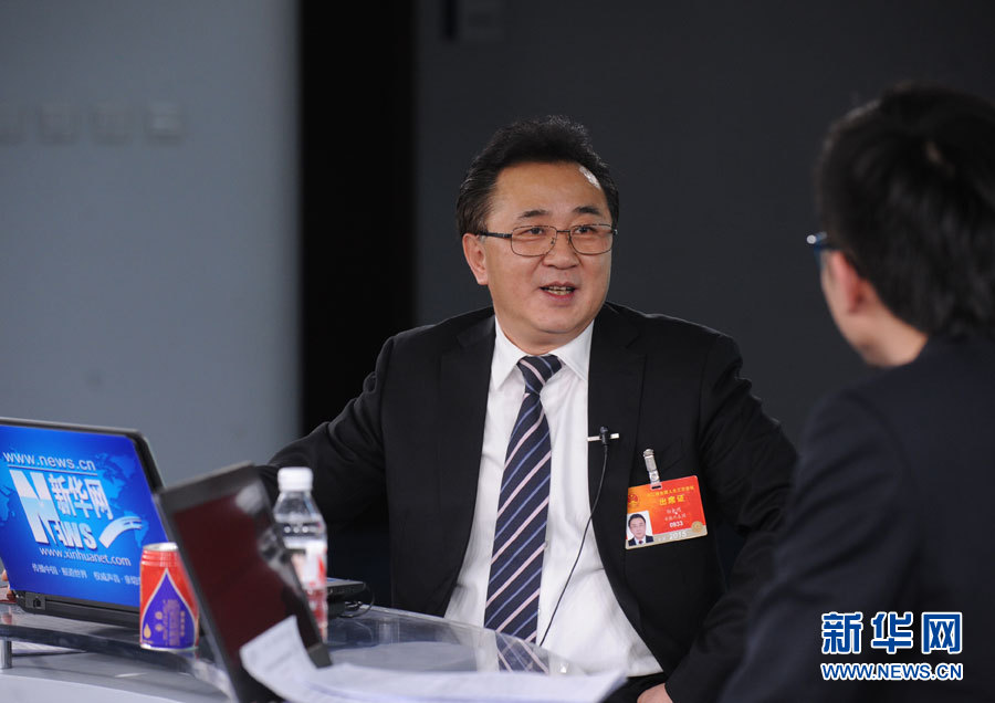 2015年3月10日,全国人大代表、安徽省蚌埠市委副书记、市长白金明做客新华访谈,与网友分享他对依法治国、依法行政的体会和期待,以及介绍建设法治蚌埠的规划部署。图为白金明与主持人交谈。 新华网 陈竞超 摄