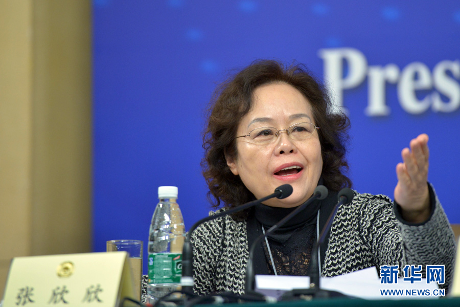 全国政协十二届三次会议举行记者会,邀请全国政协常委朱维群、黄洁夫和全国政协委员胡晓义、李彦宏、俞敏洪等谈促进民生改善与社会和谐稳定,并回答记者提问。图为记者会主持人张欣欣。新华网/中国政府网 郭小天 摄