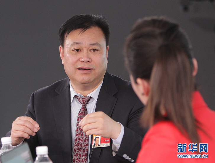 2015年3月12日,全国政协委员、民建天津市委会副主委、天津市庆达投资集团有限公司董事长孙太利作客新华访谈两会特别节目。图为孙太利回答主持人问题。 新华网 郭 研 摄