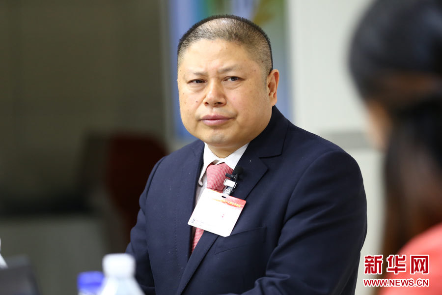 2015年3月12日,全国政协委员、河南省工商联副主席、河南弘昌集团、河南龙潭信阳毛尖集团董事长陈世强做客新华会客厅。图为陈世强与主持人交谈。新华网 李江 摄