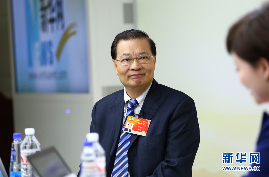 2015年3月12日,全国政协委员、香港民建联主席谭耀宗做客新华会客厅。图为谭耀宗在访谈中。新华网 李江 摄
