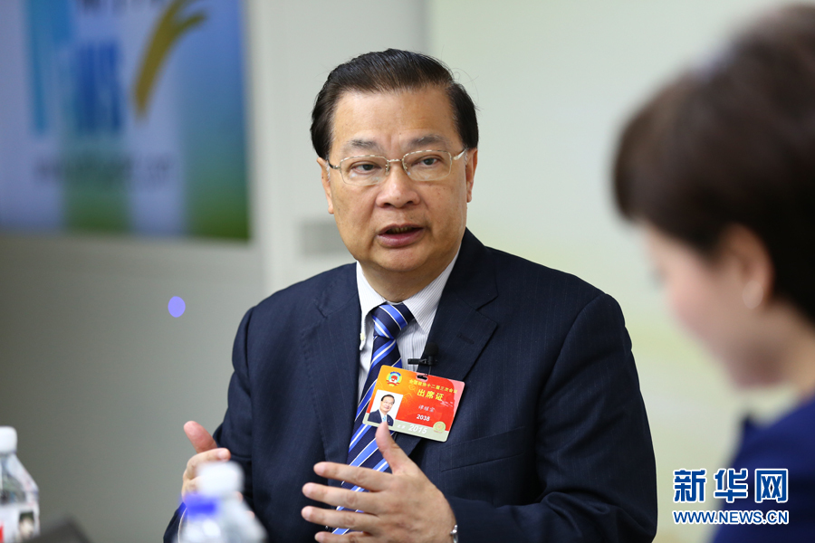 2015年3月12日,全国政协委员、香港民建联主席谭耀宗做客新华会客厅。图为谭耀宗解答主持人问题。新华网 李江 摄