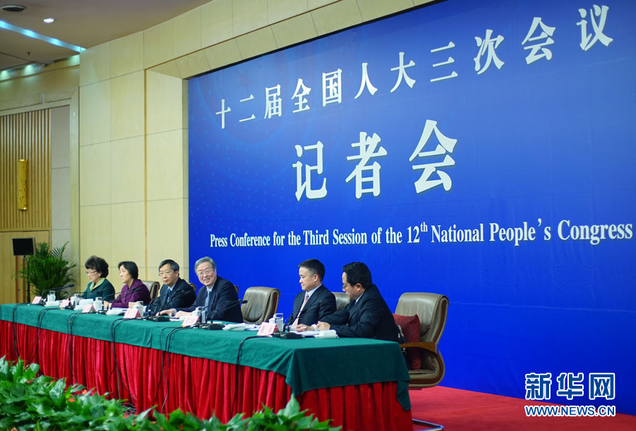十二届全国人大三次会议新闻中心于3月12日在梅地亚中心多功能厅举行记者会,邀请中国人民银行行长周小川,中国人民银行副行长、国家外汇管理局局长易纲,中国人民银行副行长潘功胜,丝路基金有限责任公司董事长金琦就金融改革与发展回答中外记者提问。图为中国人民银行行长周小川等答记者问。新华网/中国政府网 郭小天摄