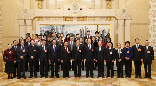 3月13日,中共中央政治局常委、全国政协主席俞正声在北京人民大会堂会见参加全国政协十二届三次会议新闻报道工作的中央主要新闻媒体负责同志和编辑记者代表,向所有参加大会报道的新闻工作者表示诚挚慰问和衷心感谢。新华社记者 鞠鹏 摄