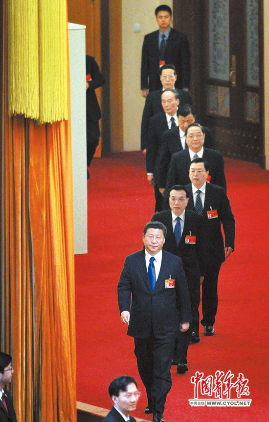 3月12日,在人民大会堂举行十二届全国人大三次会议第三次全体会议,习近平、李克强、张德江、俞正声、刘云山、王岐山、张高丽等党和国家领导人步入会场。