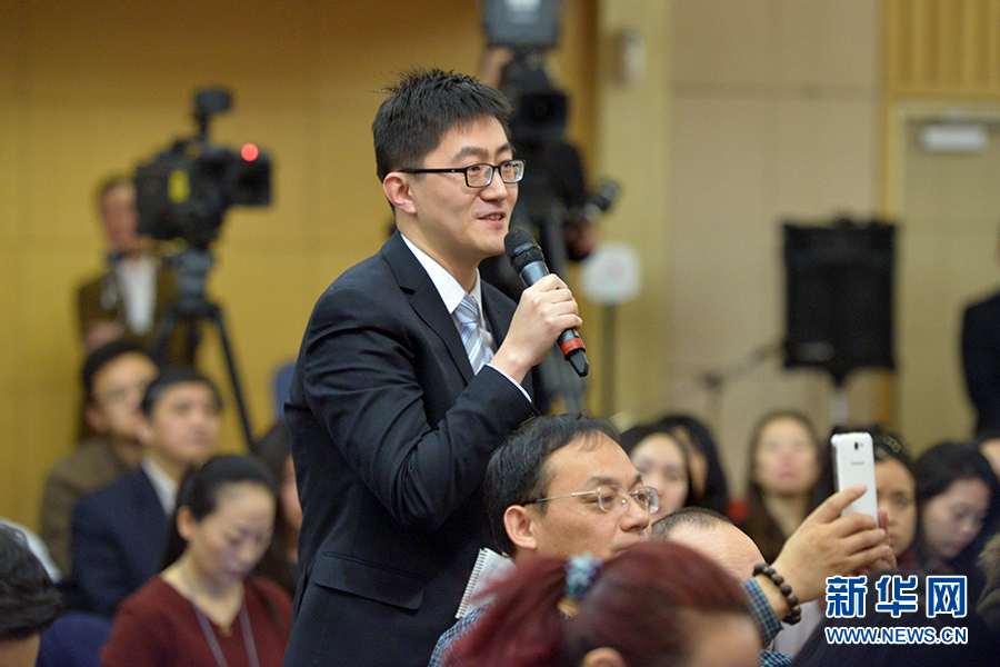 3月13日上午10时,十二届全国人大三次会议新闻中心邀请四川大学校长谢和平、江苏省教育厅厅长沈健、广东省教育厅厅长罗伟其、海南大学校长李建保、贵州大学校长郑强就完善高等教育治理结构的相关问题回答中外记者提问。图为中央人民广播电台、央广网记者提问。新华网/中国政府网 郭小天 摄