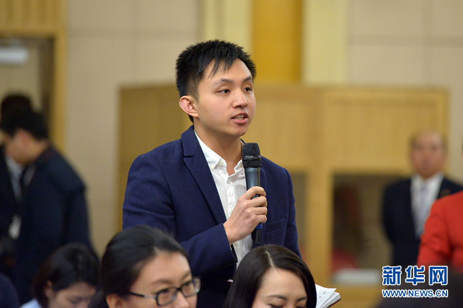 3月13日上午10时,十二届全国人大三次会议新闻中心邀请四川大学校长谢和平、江苏省教育厅厅长沈健、广东省教育厅厅长罗伟其、海南大学校长李建保、贵州大学校长郑强就完善高等教育治理结构的相关问题回答中外记者提问。图为贵州广播电视台记者提问。新华网/中国政府网 郭小天 摄