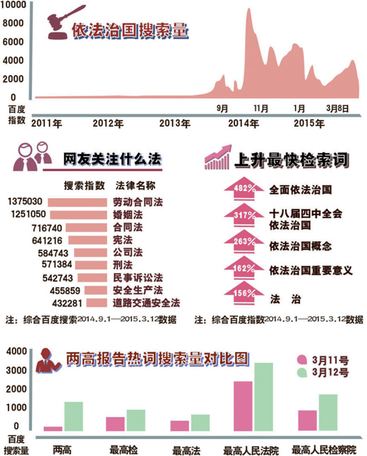 这一点,也能从搜索曲线上得到反映:在十八届四中全会召开后,“依法治国”的搜索量始终处于高位,特别是今年两会,又迎来了一个新的高峰。