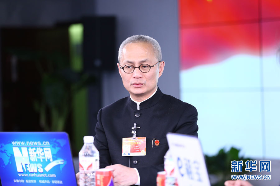 2015年3月14日,全国人大代表、凤凰古城文化旅游投资股份有限公司董事长叶文智做客新华会客厅。图为叶文智在访谈中。新华网 李江 摄