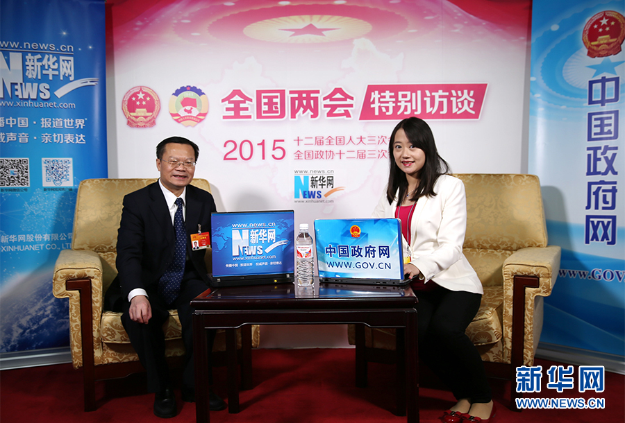2015年3月15日上午9时,第十二届全国人民代表大会第三次会议在人民大会堂举行闭幕会。图为会议开始前,全国人大代表、湖南省益阳市市长胡忠雄在人民大会堂新华网/中国政府网两会访谈间接受记者专访。新华网 周柏豫摄