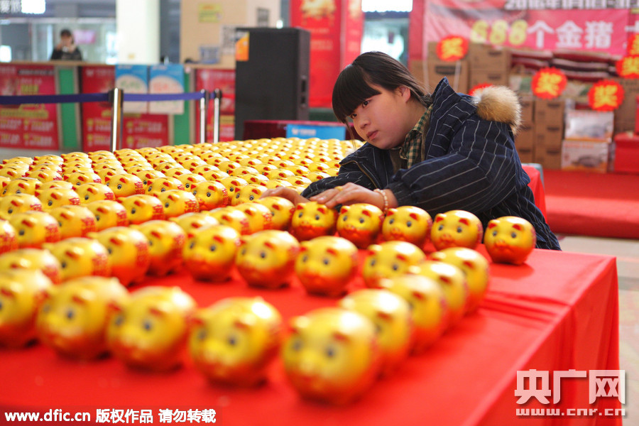 2015年12月31日,山东省滨州市一家商场,工作人员正将688个金猪摆上奖台,为2016元旦的商业促销做准备。