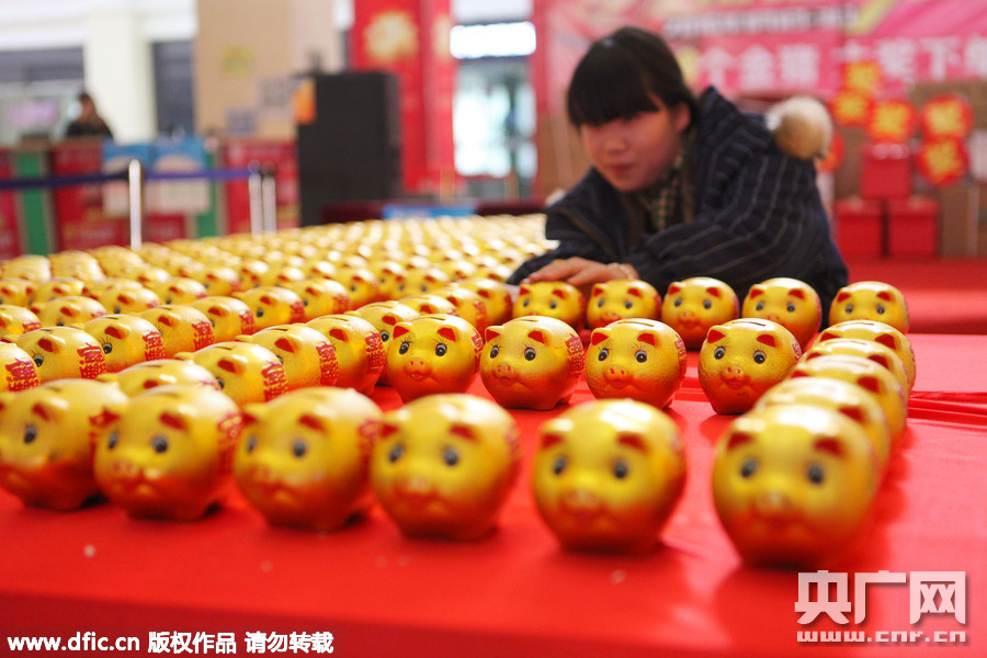 2015年12月31日,山东省滨州市一家商场,工作人员正将688个金猪摆上奖台,为2016元旦的商业促销做准备。