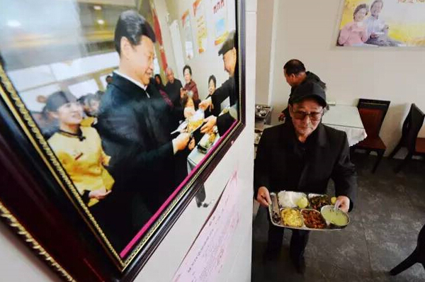 鸿瑞园店装修得朴素,最特别的是杨林太身后的柱子上,挂着一张习近平总书记为他端饭的照片。2013年2月4日,习近平到甘肃考察,曾经来这里了解社会化养老情况。他端起一个盛满饭菜的餐盘,走到杨林太面前,轻轻送上,请他用餐。自此,杨林太成了“饭友”口中“习总接见过的人”。