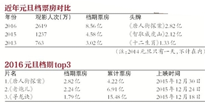 2016年内地影市第1周(2015年12月28日-2016年1月3日)总观影人次4546万,总票房14.76亿,大盘整体回暖。上映第二周的《老炮儿》逆袭夺冠4.37亿,累计6.91亿;新片喜剧《唐人街探案》势头不错收3.96亿,累计4.22亿;《寻龙诀》余力犹存再揽3.37亿,累计15.48亿;《恶棍天使》1.25亿,累计6.35亿;新片《一念天堂》、《小门神》、《一切都好》分别入账7460万、6700万、2360万;《万万没想到》报收400万,累计3.21亿。2016年元旦档3天总票房达8.56亿,创历史新高,同比增长率达86.9%。
