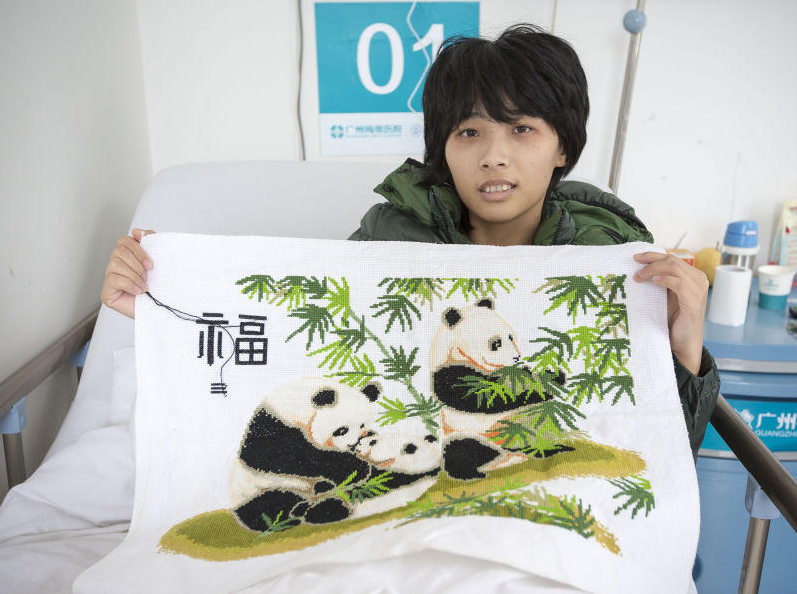 林秋芳说,这两年,全家人唯一的收入来源,是弟弟种菜每个月400多元的微薄收入。"所以就算哪里疼,我也能忍就忍,就算痛得哭起来,也只能在被窝里抹眼泪。"家中的经济困难与疾病缠身并没有压倒林秋芳。在好心人的帮助下,她得以回到广州的医院继续治疗,到目前为止,她还只能靠着医院垫付医药费。不过,林秋芳依旧毅然乐观地面对治疗,还开始一针一线地做起了十字绣。她告诉记者,最初做十字绣,是太长时间躺在床上实在闷得无聊。而且,有时候弟弟不在身边,她全身太疼了,必须靠十字绣转移自己的注意力。更重要的是,她希望多做一些十字绣,能够卖给善心人士,帮补家用,筹集自己的医药费。(广州日报记者 申卉 文 苏俊杰 图)