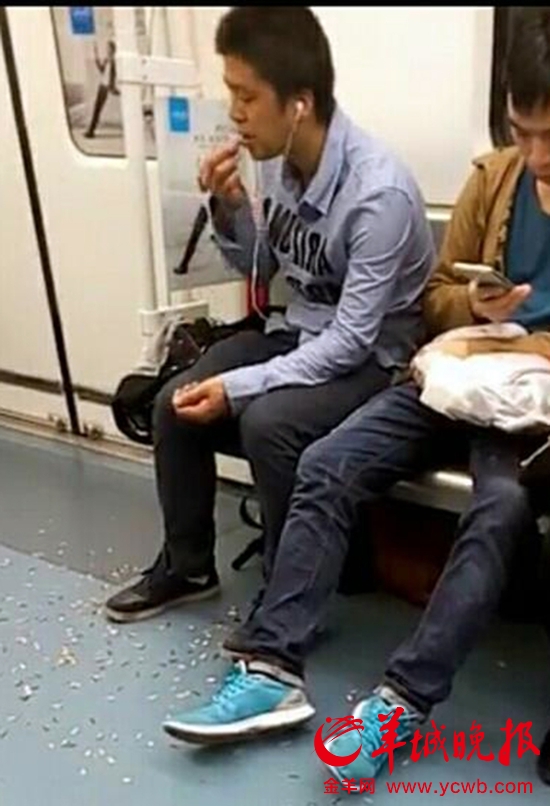 原标题:广州一男子搭地铁嗑瓜子 网友:与"凤爪女"天生一对
