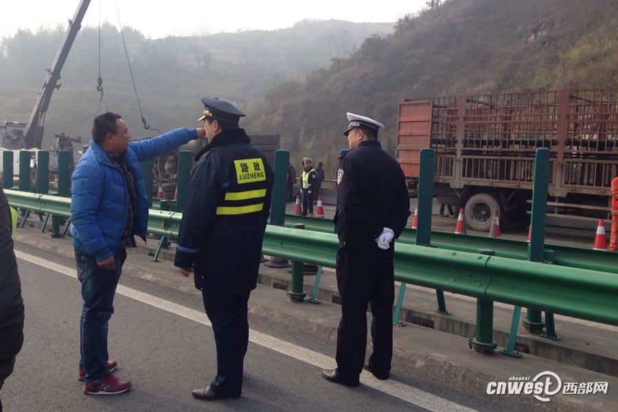 陕西高速满载生猪货车侧翻 现场使用吊车运猪