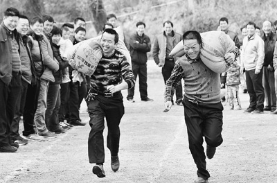 图为两名高田乡里木村农民肩扛稻谷在赛道上奔跑。