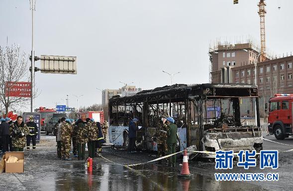 1月5日,在宁夏银川市贺兰县,公交车着火后被烧毁。 新华社记者 李然 摄